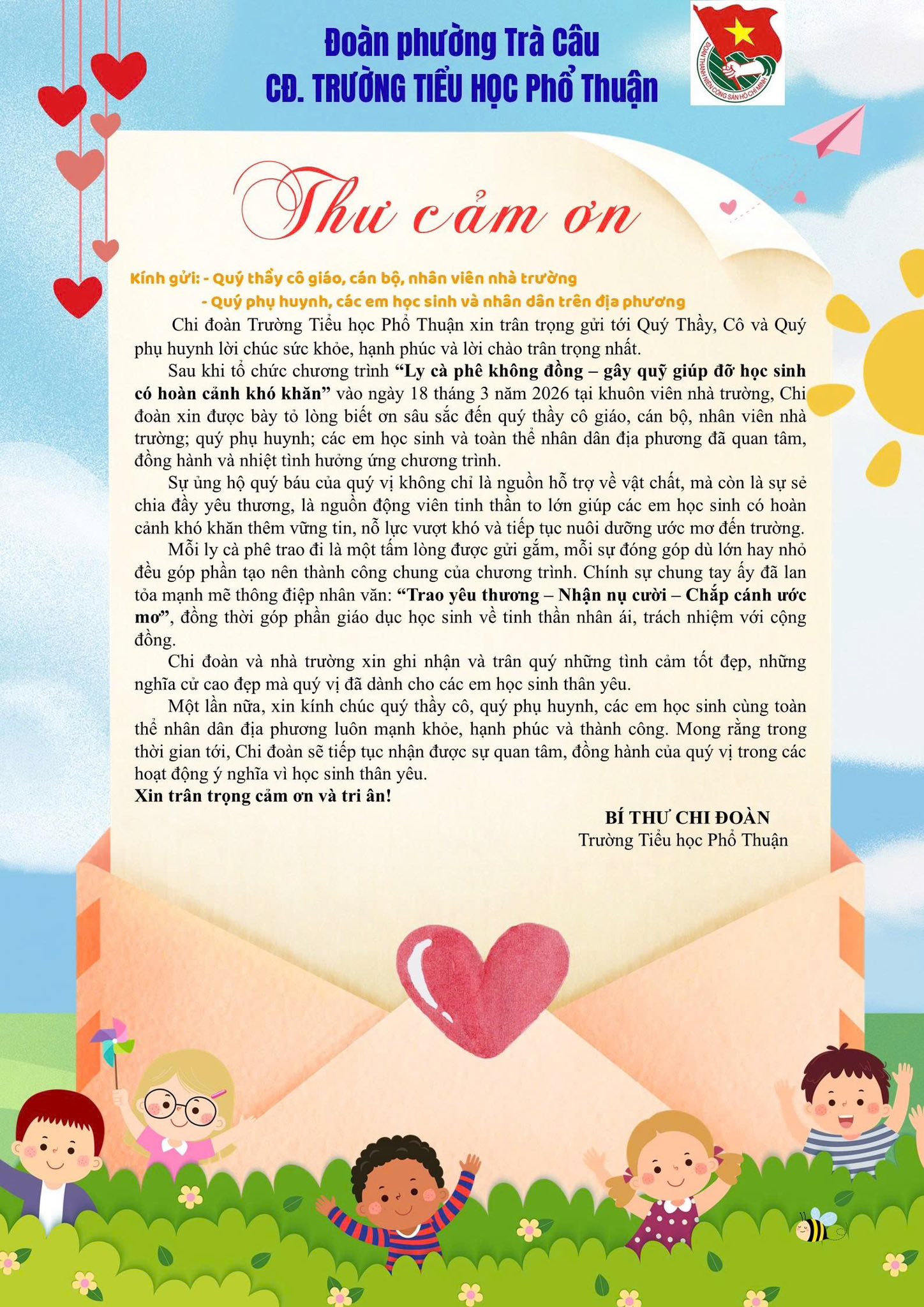 Chi đoàn và Liên đội Trường Tiểu học Phổ Thuận xin chân thành cảm ơn quý phụ huynh và các em học sinh đã nhiệt tình ủng hộ chương trình “Ly cà phê 0 đồng”. 💛